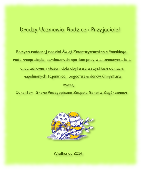 Dnia 16 kwietnia 2014 roku w Zespole Szkół w Zagórzanach odbyła się uroczysta akademia z okazji zbliżających się Świąt Wielkanocnych. Wśród zaproszonych gości byli emerytowani nauczyciele i pracownicy administracyjni szkoły. Podczas uroczystości uczniowie z klasy II SP pod opieką mgr E. Zasowskiej zaprezentowali bogaty program artystyczny...