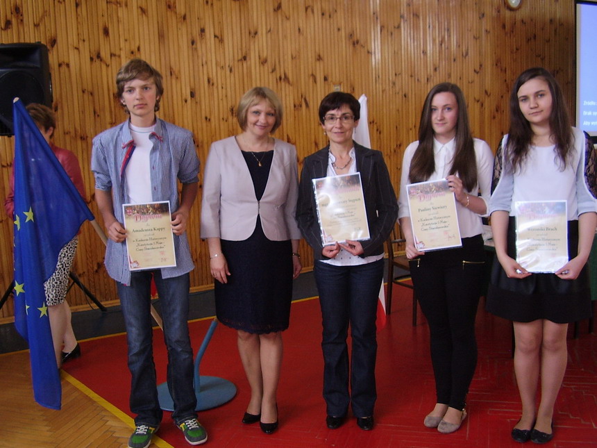 W finale VII edycji Konkursu Historycznego „Konstytucja 3 Maja – Czasy Stanisławowskie" dla uczniów szkół gimnazjalnych powiatów: gorlickiego, nowosądeckiego i limanowskiego, organizowanego przez Panią poseł Barbarę Bartuś, naszą szkołę reprezentowali: Paulina Siewiera, Weronika Brach z kl. 3 i Amadeusz Kappy z kl. 2. Dnia 13. maja br. w MZS Nr 4 w Gorlicach uczniowie indywidualnie rozwiązywali bardzo szczegółowy test wiedzy. W tym roku zmagało się 105 gimnazjalistów z 35 szkół. Nasza wybrana trójka wykazała się szeroką wiedzą i dobrą znajomością czasów stanisławowskich oraz okoliczności uchwalenia Konstytucji 3 Maja. W siódmej edycji zajęli siódme miejsce, wyprzedzając aż 28 innych drużyn. Poziom był bardzo wysoki, liczył się każdy zdobyty punkt. Nasi uczniowie mogą być z siebie dumni i zasługują na uznanie. Otrzymali indywidualne dyplomy oraz nagrody rzeczowe.