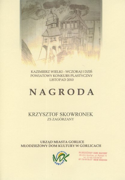 Dnia 25 listopada br. w Młodzieżowym Domu Kultury w Gorlicach zostały wręczone nagrody uczniom biorącym udział w konkursie plastycznym pt. „Kazimierz Wielki wczoraj i dziś”. Jury konkursowe w składzie; Marek Kretowicz /artysta grafik/, Janusz Krauze /artysta rzeźbiarz/ i Bartłomiej Belniak /artysta plastyk/ oceniało 216 prac. Wśród 30...