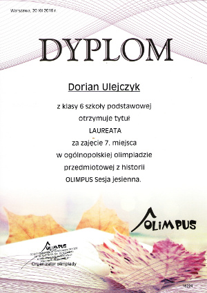 Szóstoklasista Dorian Ulejczyk zdobył Dyplom Laureata ponadprogramowej Olimpiady z Historii OLIMPUS. Pisemny test sesji jesiennej rozwiązywał jako jeden z 457 uczniów. Uzyskał 220 pkt i to mu dało 7 miejsce.